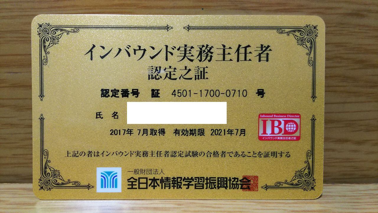 第1回インバウンド実務主任者認定試験の更新手続きが完了し、到着を待っていた認定証カードがようやく到着しました。