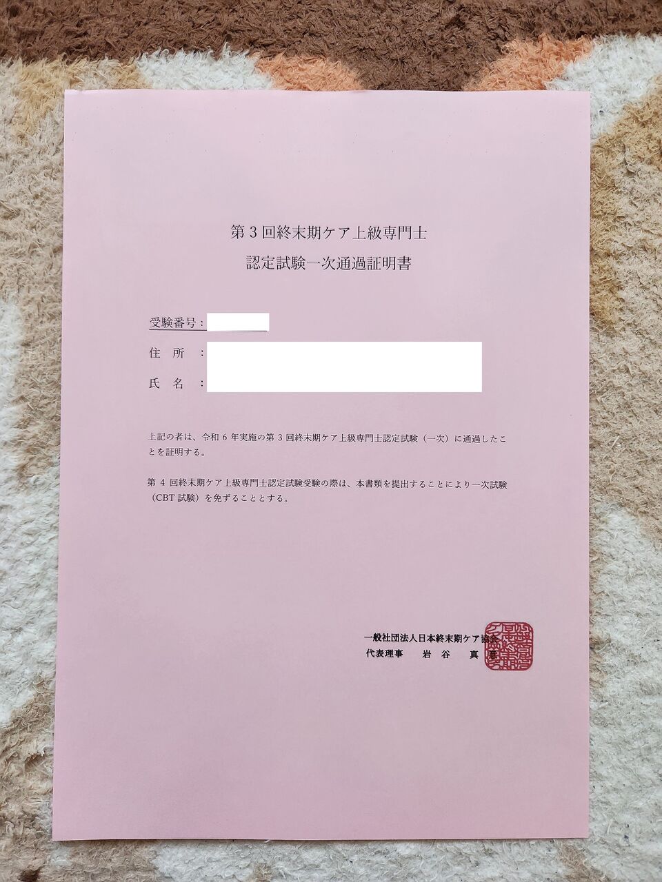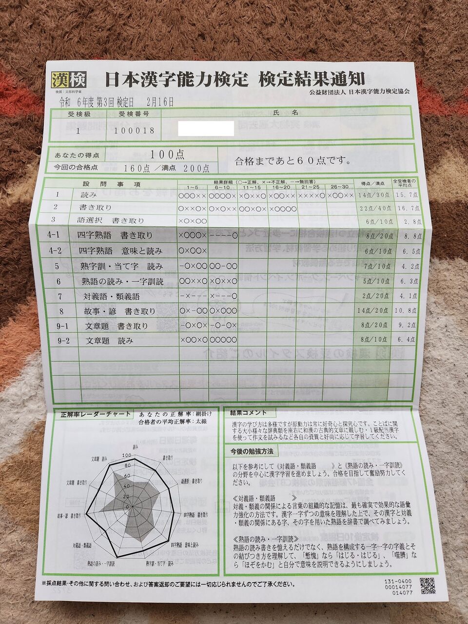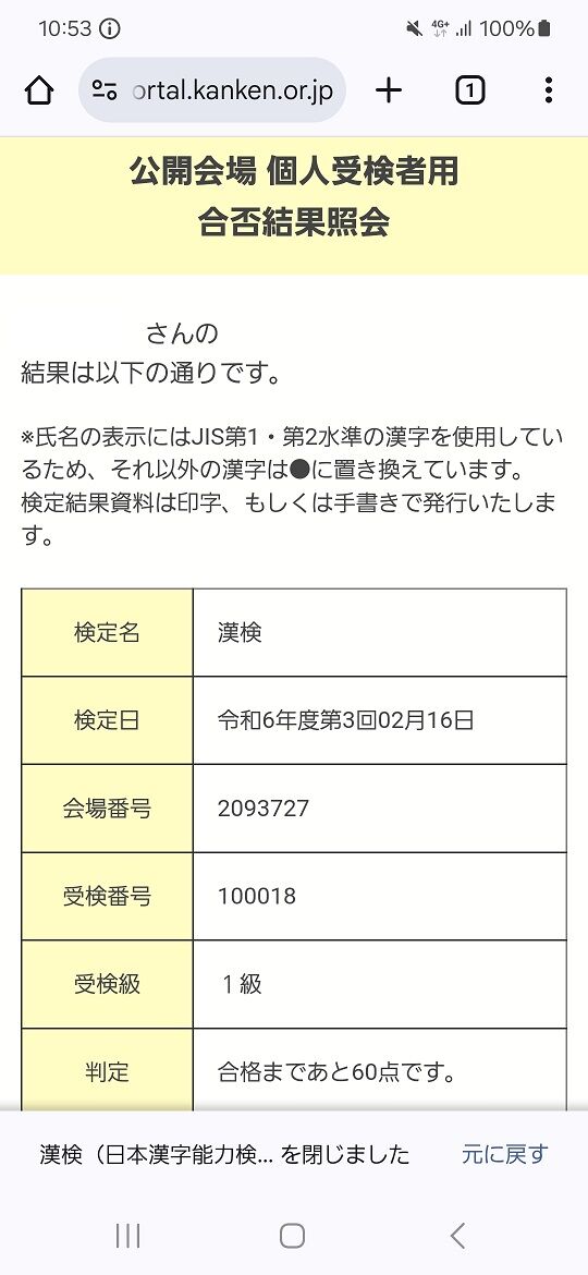 令和6年度(2024年度)第3回漢検1級の試験結果通知が到着しました。