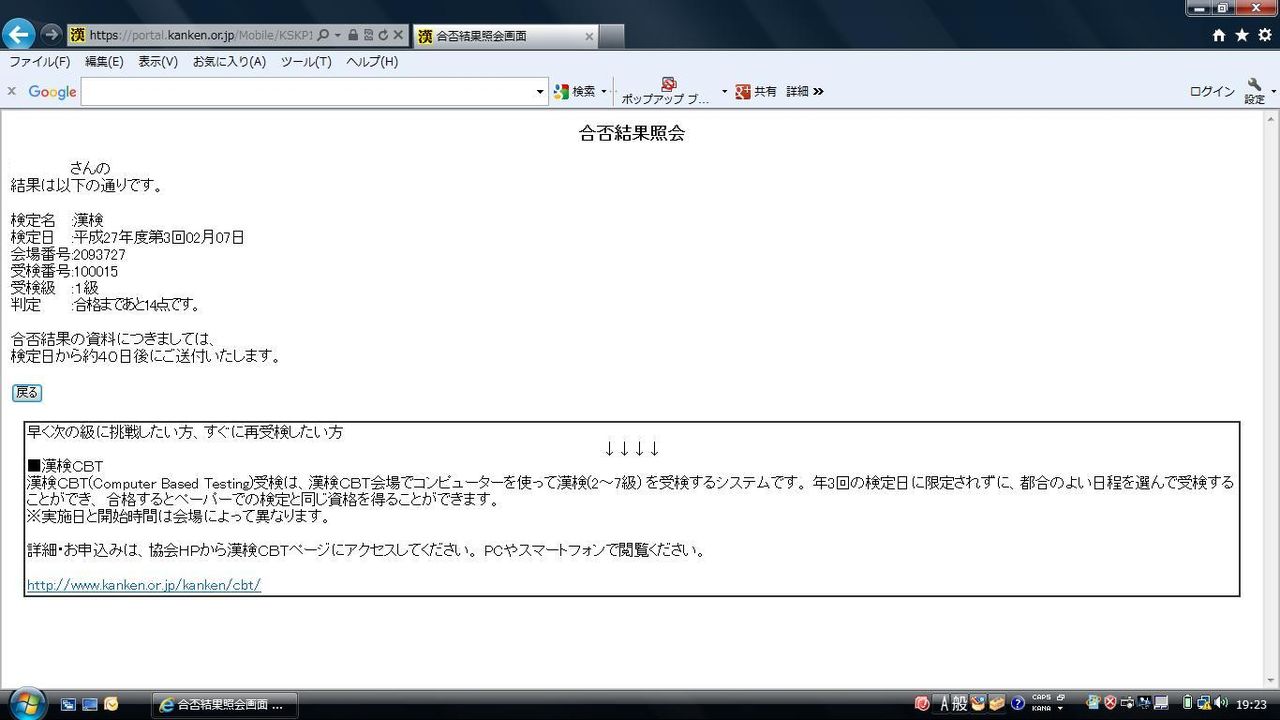 去る2月7日に受検し初合格が期待されていた平成27年度第3回漢検1級の合否結果サービスが本日午前10時より照会可能となりましたので、早速スマホで確認してみました。