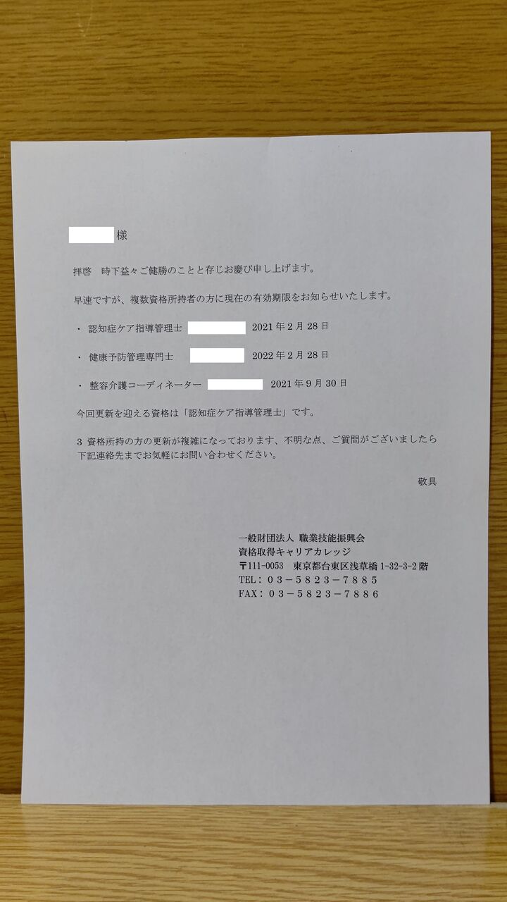 一般財団法人 職業技能振興会 資格取得キャリアカレッジが実施している認知症ケア指導管理士(初級)の更新案内が届きました。