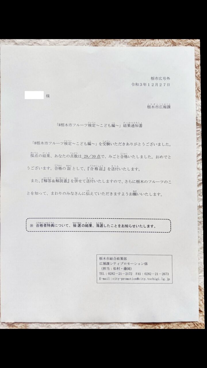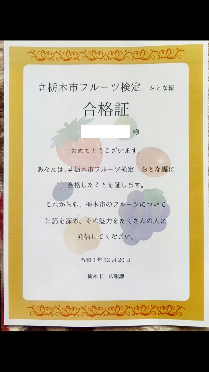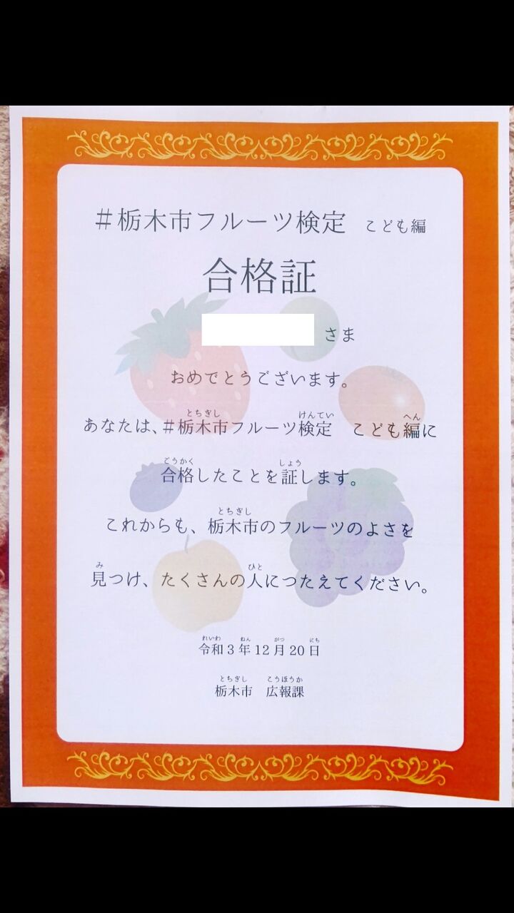 去る11月10日に挑戦した#栃木市フルーツ検定「こども編」と、11月11日に挑戦した「おとな編」の結果通知書が到着しました。